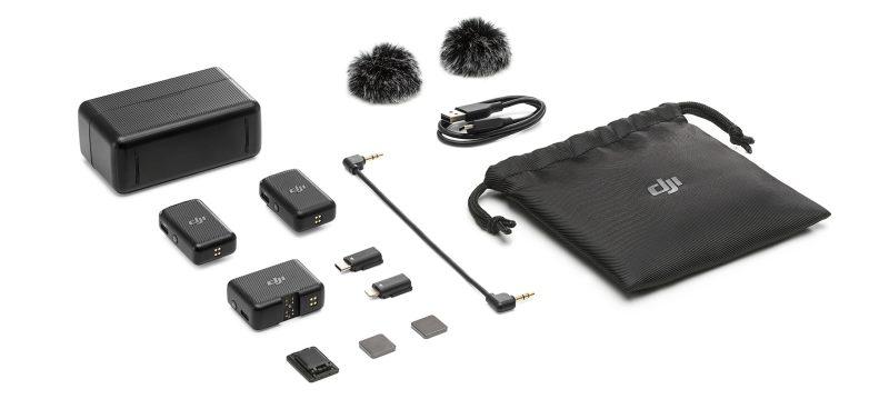 همانطور که گفتیم دو فرستنده و یک گیرنده و جعبه شارژ اجزاء اصلی DJI Mic Wireless Microphone Kit به شمار میآیند. علاوه بر این از دو خَز محافظت در برابر نویزِ باد، هات شو برای اتصال گیرنده به دوربین، دو عدد آداپتور 3.5 میلیمتری TRS به USB و لایتنینگ، کابل USB Type-C برای شارژ، کابل 3.5 میلیمتری TRS برای اتصال میکروفونهای لاوالیر lavalier و کیسه کوچکِ نگهدارنده یک پکیج کامل است.